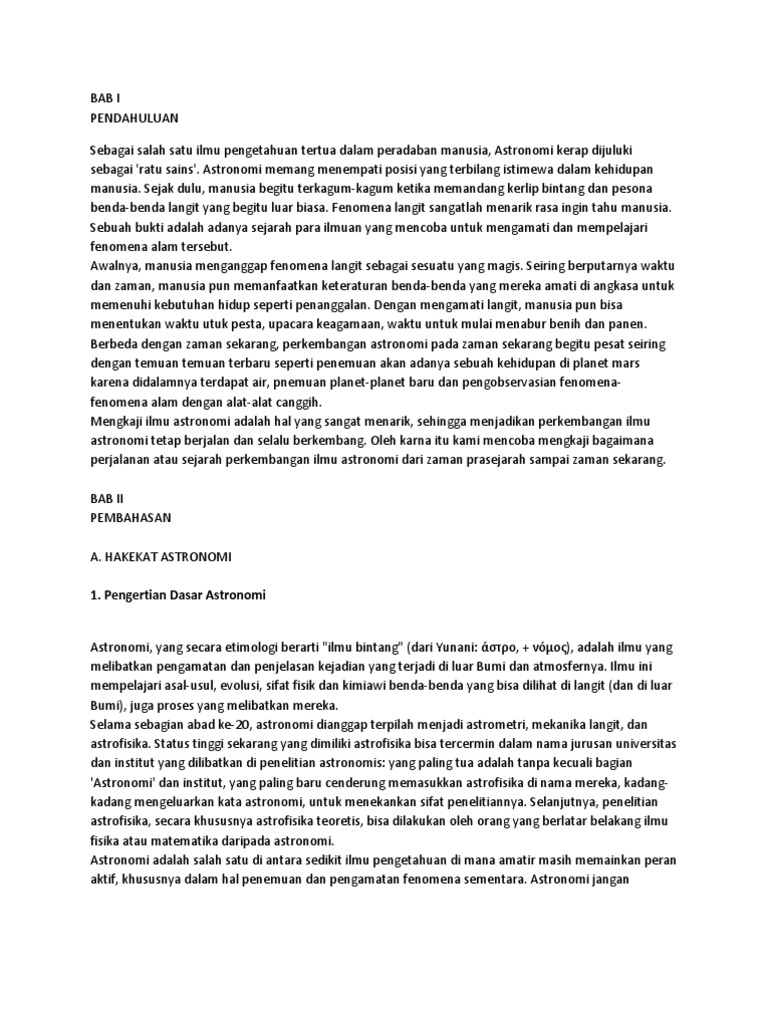 Perkembangan dalam bidang astronomi perkemba perkembanga ngan n dalam dalam bidang bidang astron astronomi omi dan penerok penerokaan aan angka angkasa sa lepas lepas astronomi astronomi (astronomy) (astronomy) adalah kajian saintifik mengenai alam semesta. Selama repelita v, upaya yang dilakukan pemerintah dalam perkembangan iptek di berbagai bidang diatas tentunya membawa dampak bagi perubahan kehidupan manusia baik dampak positif maupun dampak negatif. Dinasti abbasiyah, perkembangan ilmu pengetahuan, perkembangan dalam ilmu agama, ilmu umum dan ilmu teknologi, serta ilmuwan pada masa dinasti abbasiyah. Alam semesta merupakan bagian yang tidak terlepas dari dunia. Dalam dunia astronomi, ia bisa membuktikan bahwa bumi berputar pada sumbunya.