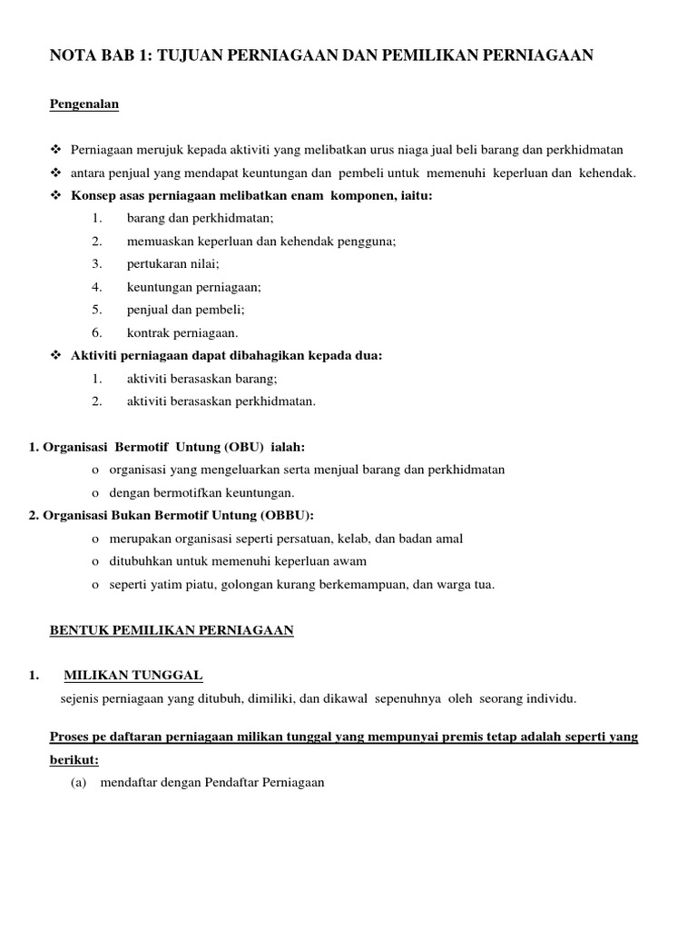 Asas sumber modal lebih banyak daripada milikan tunggal. Milikan tunggal ialah sejenis perniagaan yang ditubuhkan, dimiliki dan dikawal sepenuhnya oleh seorang individu. Perniagaan tgkt4 bab1 (1.0.1 konsep asas & 1.0.2 aktiviti perniagaan). Bisnis pemilik tunggal menjelaskan, termasuk pro dan kontra, seperti kontrol, pertanggungjawaban, pajak, dan kebanyakan usaha kecil adalah kepemilikan tunggal, karena jenis usaha ini adalah cara termudah dan paling murah untuk memulai bisnis. · keuntungan dapat mengukur prestasi dan menentukan hala tuju perniagaan,melambangan imej perniagaan,serta membolehkan tanggungjawab sosial dijalankan.