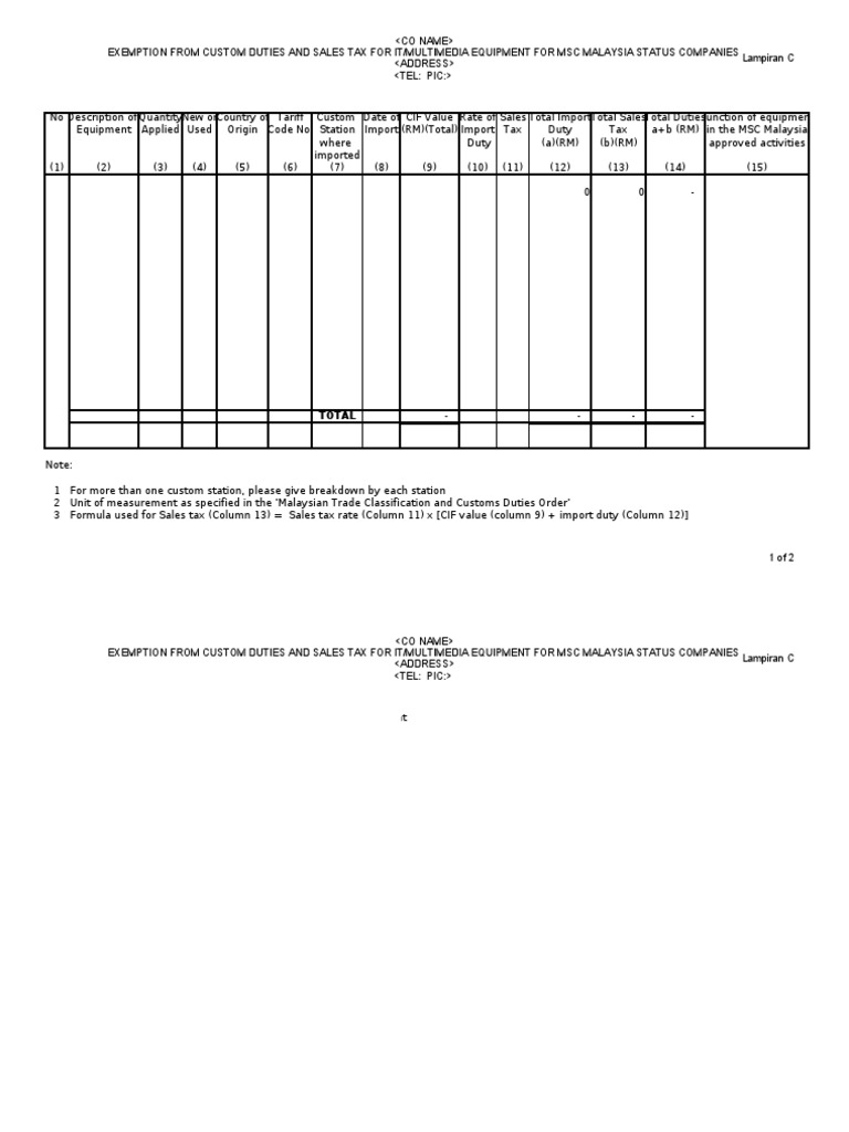 Import Duty And Sales Tax Exemption On Imported from s3.studylib.net Exemption certificate the certificate must be attached together in the import oath (customs form no. Waste, scrap and damaged raw materials and finished goods. How to apply for customs duty exemption in malaysia? Are there any exemptions for import of raw materials? A) application for mida confirmation letter surat pengesahan mida (spm) for import duty and/or sales tax exemption b) import duty and sales tax exemption on machinery and equipment for selected activities in agriculture sector 1.3.1 import duty and/or sales tax exemption on machinery and equipment; As such, import duties of 10% will be imposed and no exemption will be given. Fire, natural disaster and lost.